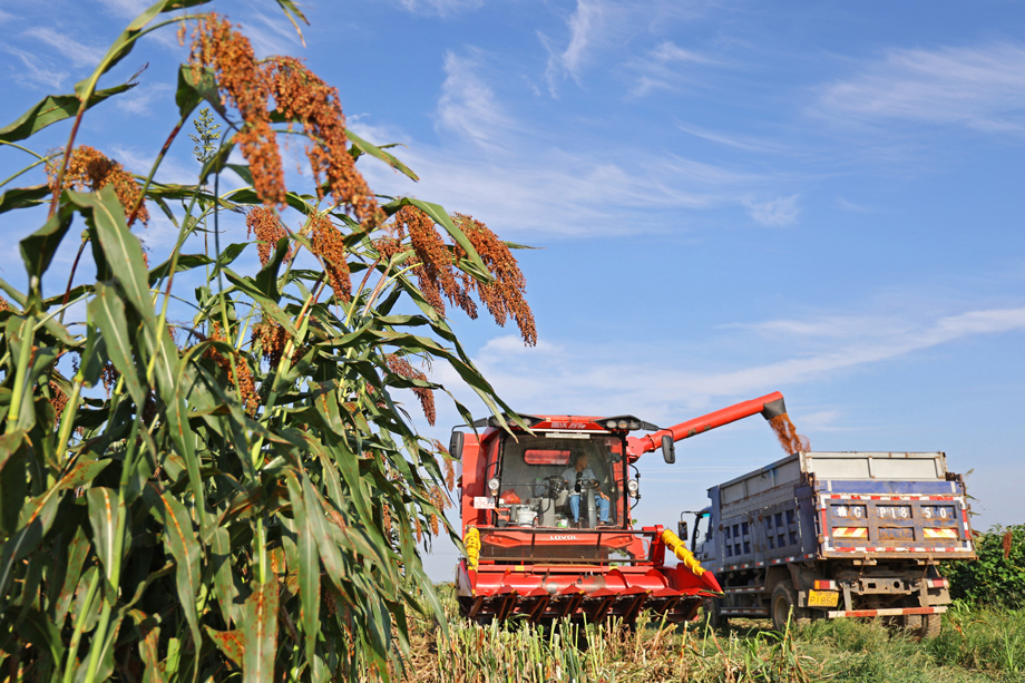 连日来,宿松县复兴镇复兴社区的农田里,农机手驾驶联合收割机抢收高粱。眼下,华阳河农场公司社会化服务的5.5万亩高粱进入成熟收获期,农场公司及时组织收购,确保粮食颗粒归仓。